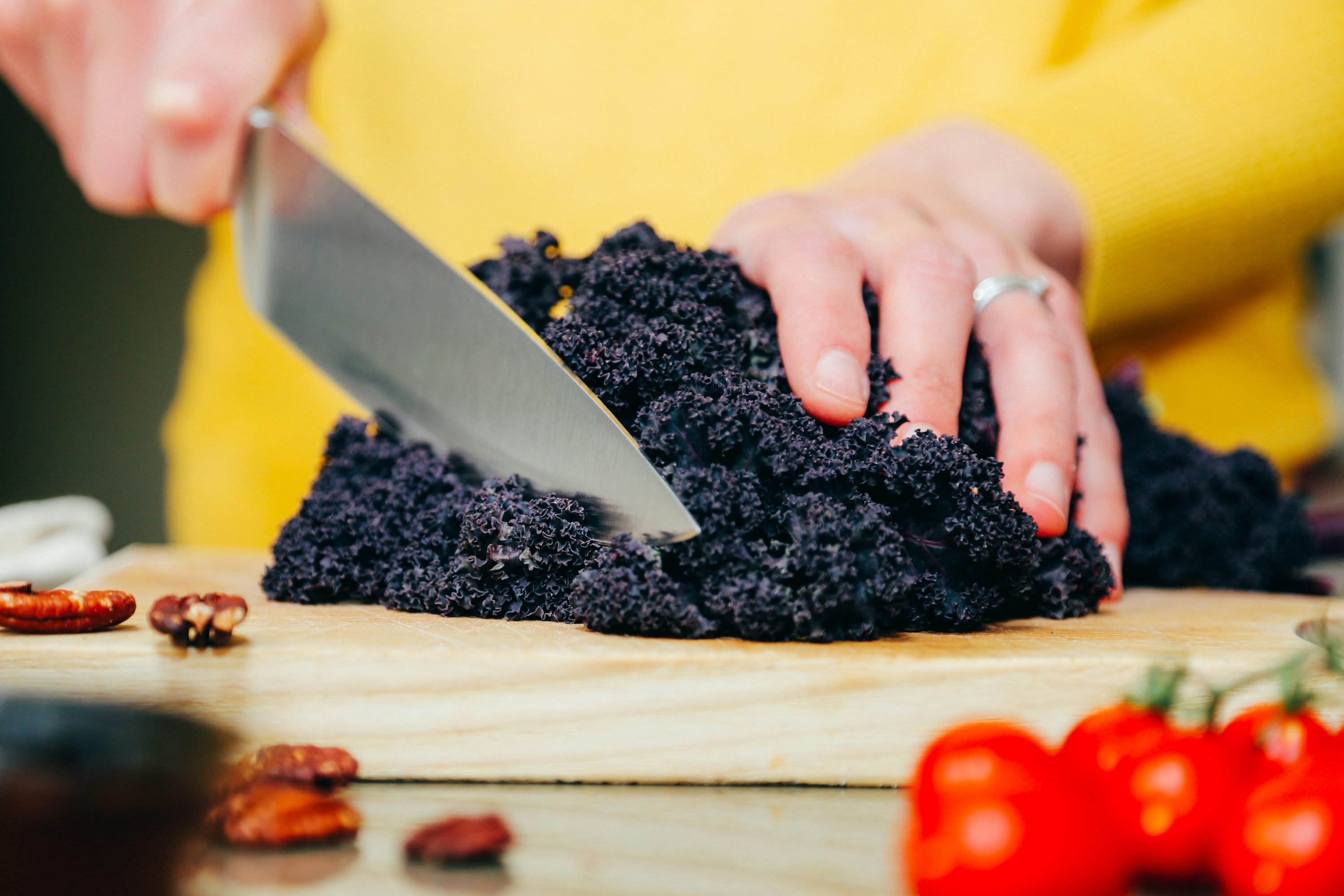 생 컬리케일을 잘게 찢어 올리브오일, 레몬즙, 발사믹 식초로 드레싱하면 영양소 파괴 없이 순수한 컬리케일효능을 누릴 수 있습니다. 견과류와 치즈를 추가하면 더욱 맛있습니다.